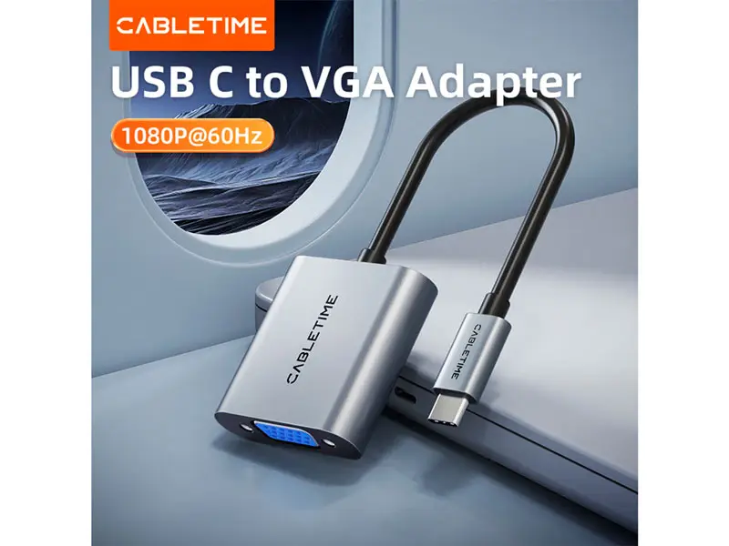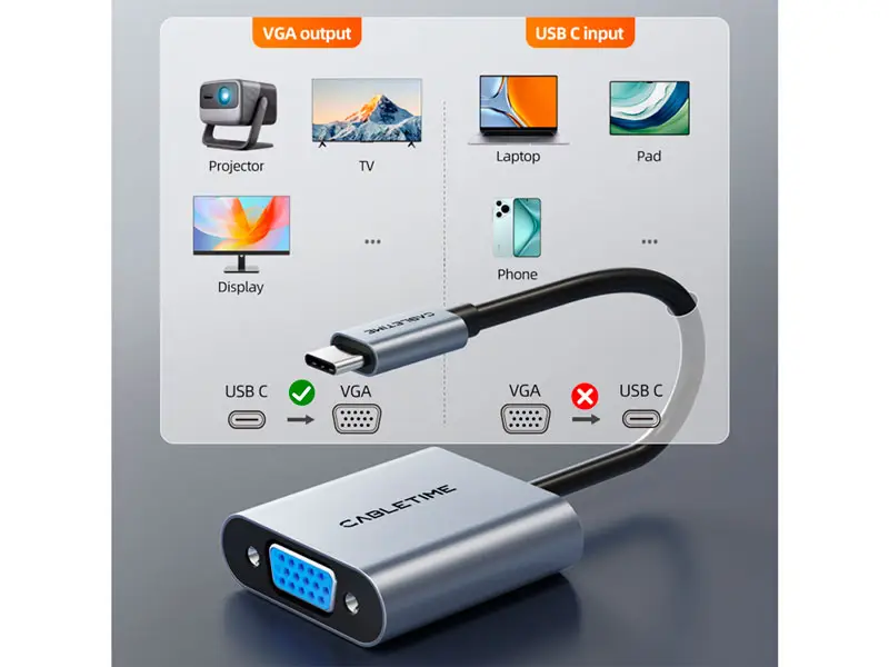 El Adaptador CABLETIME CP17A USB-C a VGA ofrece una forma simple y rentable de conectar sus dispositivos USB-C, como computadoras portátiles, MacBooks y teléfonos inteligentes, a monitores, proyectores o televisores equipados con VGA.