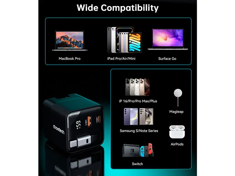 En un mundo cada vez más conectado, donde la velocidad y la eficiencia lo son todo, contar con un cargador de alto rendimiento es una necesidad. El CHOETECH PD6091 GaN de 65W ha sido diseñado para satisfacer a los usuarios más exigentes que buscan una solución de carga potente, compacta y versátil. Con tecnología de punta, múltiples puertos y un cable retráctil incorporado, este cargador es tu compañero ideal para la oficina, el hogar o los viajes.