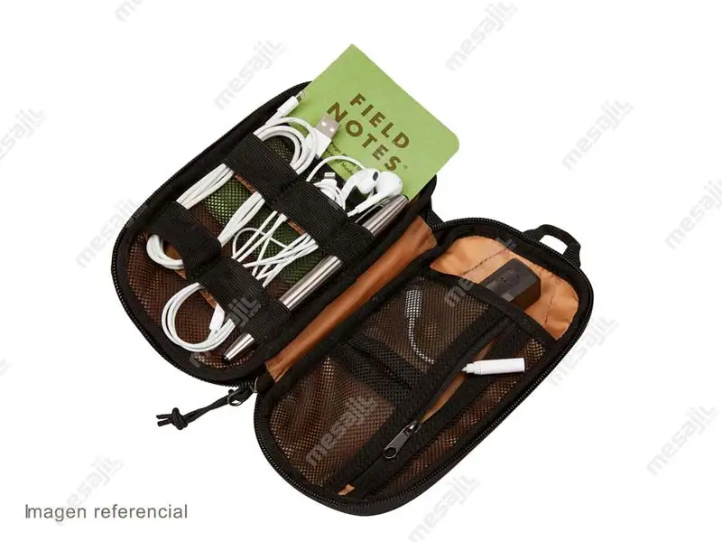 Bolsillos seguros y bandas elásticas para guardar cables, auriculares y pequeños accesorios. La funda de tamaño pequeño cabe fácilmente en una mochila o bolso. Se guarda en el bolsillo del asiento del avión para un acceso rápido al pasaporte, bolígrafo o electrónica. Materiales duraderos y protección de objetos personales.