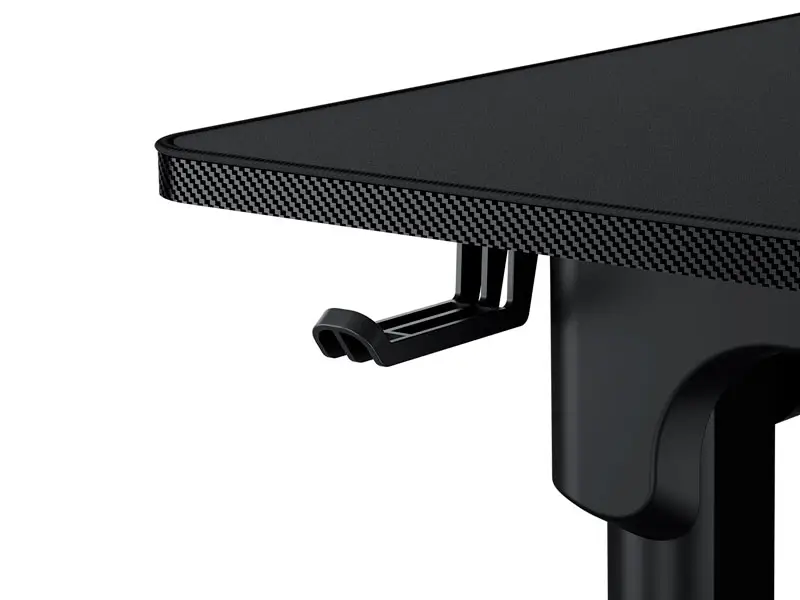 La bandeja para cables y el soporte para auriculares mantienen el escritorio despejado y organizado.