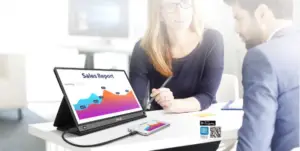 El ZenScreen Go MB16AHP es un monitor secundario idóneo para realizar presentaciones con dos pantallas y ser productivo desde cualquier lugar. Pesa solo 860 g y presenta un grosor de 9 mm que permite deslizarlo en cualquier mochila de viaje sin ningún tipo de problema.