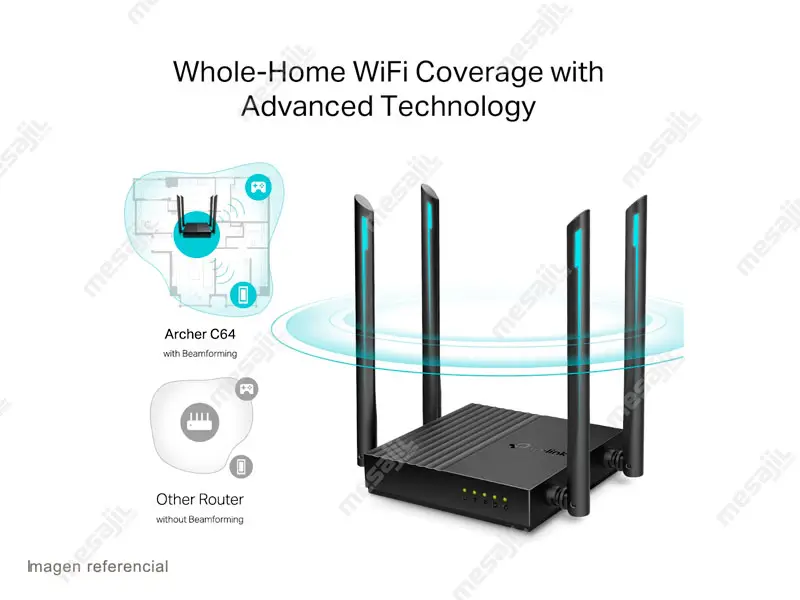 Con 4 antenas externas de alto rendimiento, Archer C64 amplifica las señales WiFi en toda la casa. La tecnología Beamforming detecta los dispositivos y concentra la intensidad de la señal inalámbrica hacia ellos, en particular para los enchufes que antes eran difíciles de alcanzar.